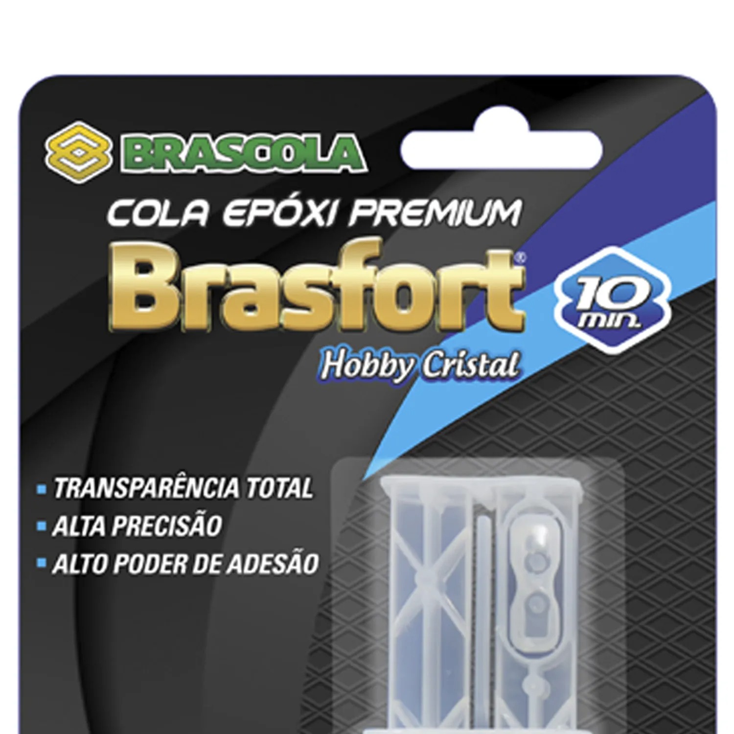 Este é um adesivo epóxi bicomponente Brasfort Hobby Cristal da Brascola, apresentado em uma seringa de 6g.