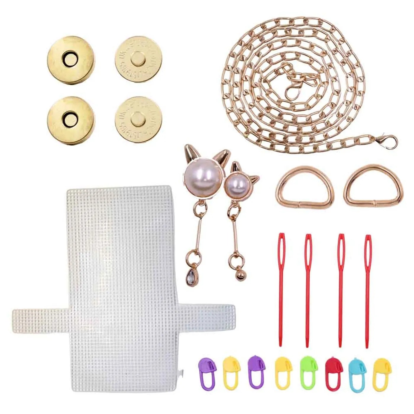 Acessórios: 2 meia-argolas douradas para fixação da alça, 4 agulhas plásticas vermelhas para costura, 5 marcadores de ponto coloridos (roxo, amarelo, verde, azul), Fecho Magnetico gato, corrente groumet com fecho mosquetão.